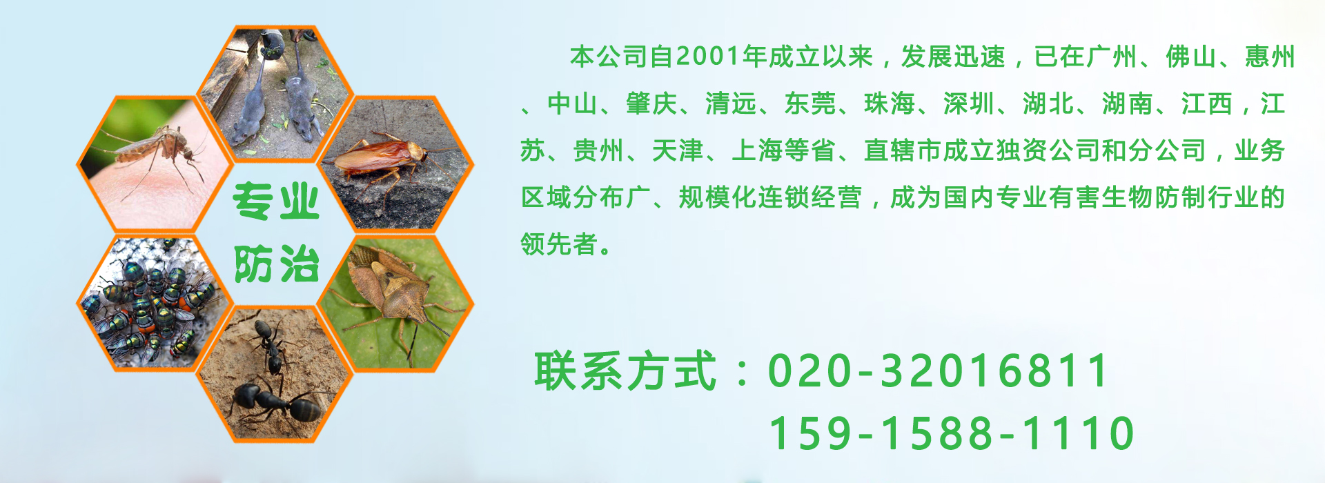 廣州億康環(huán)境科技有限公司專業(yè)從事有害生物防制、空氣治理、增香除味、清洗保潔、衛(wèi)生防疫消毒。本公司自成立以來,發(fā)展迅速,業(yè)務區(qū)域分布廣、規(guī)模化連鎖經(jīng)營,成為國內(nèi)專業(yè)有害生物防制行業(yè)的領(lǐng)先者。